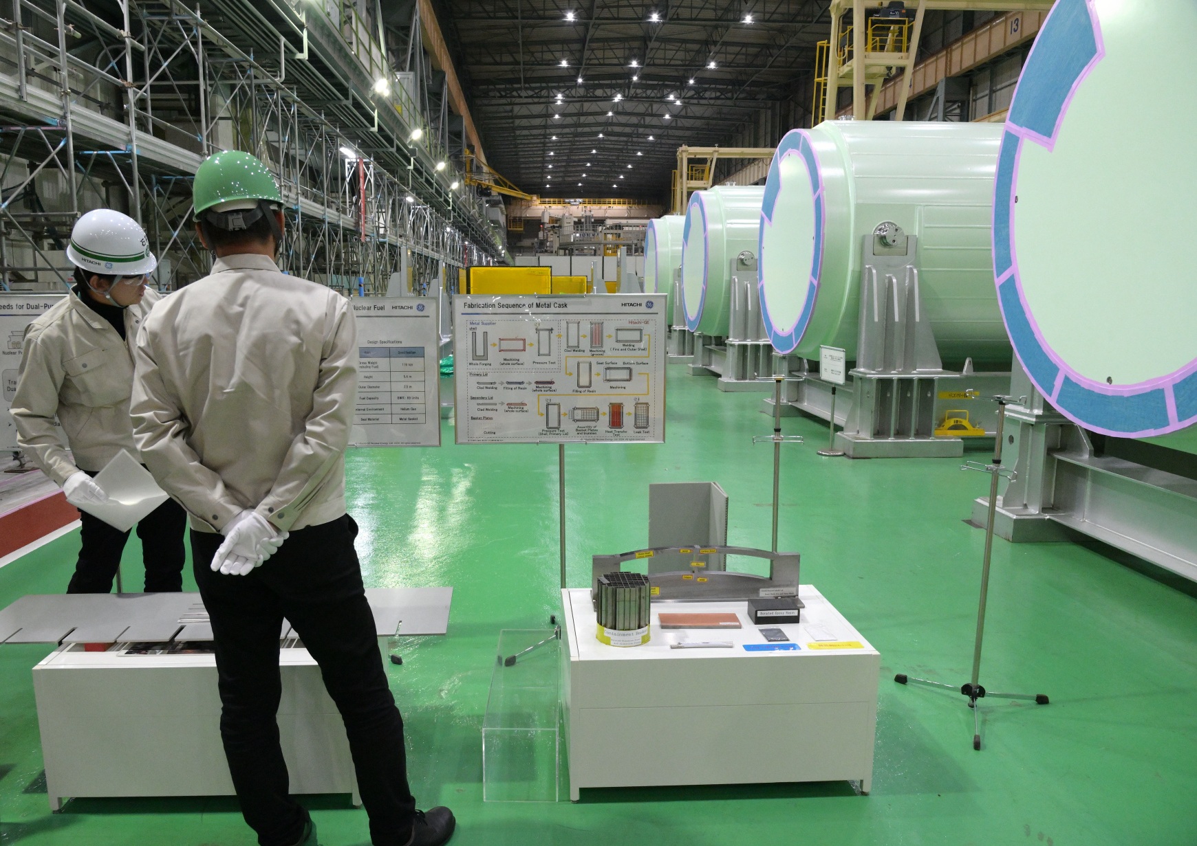 Upon his arrival at the factory, Matsui was briefed on factory tour precautions before donning a helmet, goggles, work clothes, and gloves. He then proceeded to the building known as the RC Building. Here, metal casks used for the safe transportation and storage of spent fuel from nuclear power plants are manufactured.
