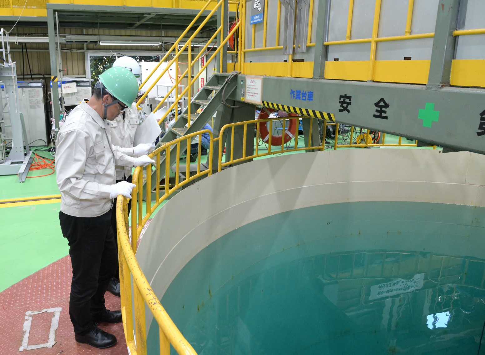 Next, Matsui headed to the BWR Preventive Maintenance Technology Center. Hitachi not only manufactures equipment for nuclear energy facilities but also handles quality assurance and quality control tasks such as installation inspections and periodic inspections. The BWR Preventive Maintenance Technology Center was constructed to conduct training aimed at improving the efficiency of such inspections, check work conditions when performing maintenance work on reactor equipment, and provide operational training. It simulates an actual BWR plant from the reactor building operating floor down to the bottom of the reactor pressure vessel (RPV) at full scale. The center's in-reactor training facility, which simulates a real reactor, uses a cylindrical test vessel filled with actual water to a depth of approximately 26 meters for underwater work training and checking.