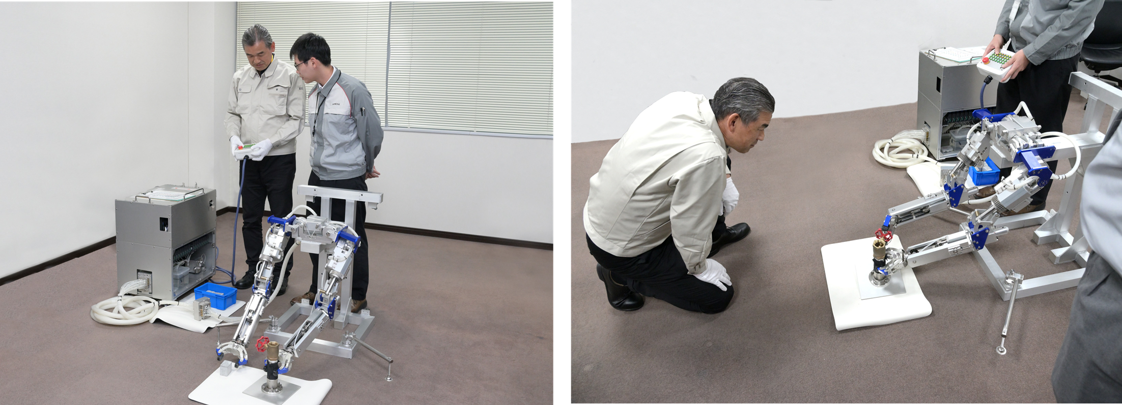 The demo unit prepared on this occasion featured two arms, performing an operation where the left arm holds the base of a valve while the right arm rotates it. While rotating a valve may seem simple at first glance, it requires fine adjustments of force applied and high positioning accuracy, making it a difficult movement for motor-driven robots.