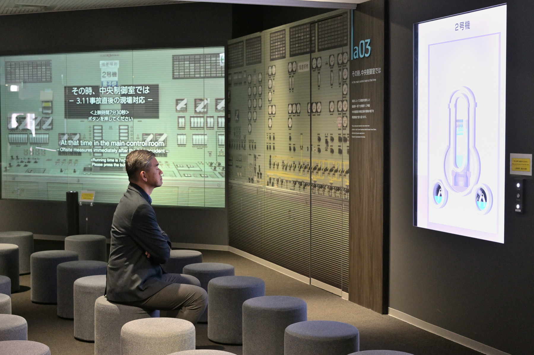 The TEPCO Decommissioning Archive Center is a two-story building. The first floor is a zone that presents various information about the decommissioning operations, while the second floor is a zone displaying memories and records of the accident, as well as the reassessment and lessons learned from it. At the entrance, Matsui was greeted by staff and first guided to the theater hall on the second floor. This is where visitors can watch a video that summarizes the events from when the Great East Japan Earthquake struck to the nuclear accident and the subsequent response. From the video, which tracks the progression of the accident in a factual manner, one gains a renewed sense of the tension that was present at the site at the time.